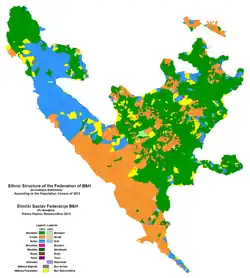 La Federación de Bosnia y Herzegovina comprende el 51% del territorio de Bosnia y Herzegovina y acoge al 60% de la población total del país. Es importante comentar que todos los datos de población, incluidos los relacionados con la distribución étnica, pueden no ser del todo exactos al no existir cifras oficiales de censo. A continuación las convenciones por color señalarán la etnia/población y su porcentaje así: