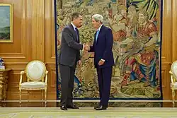 También acudió a la Ciudad del Vaticano para reunirse con el papa Francisco,[41] y viajó a Portugal,[42] Marruecos[43] y Francia,[44] además de haber sido invitado por los reyes de los belgas en la conmemoración del centenario de la Primera Guerra Mundial en Lieja, el 4 de agosto de 2014.[45] El 24 de septiembre del mismo año, viajó a Nueva York para asistir a la Cumbre sobre el Clima 2014 y a la apertura del debate general del lxix período de sesiones de la Asamblea General de la Organización de las Naciones Unidas.[46] Entre septiembre y diciembre, realizó cinco viajes oficiales más, en concreto a los Países Bajos,[47] Luxemburgo,[48] Bélgica,[49] Italia[50] y Alemania.[51] También asistió, en diciembre de 2014, a la xxiv Cumbre Iberoamericana de Jefes de Estado y de Gobierno, celebrada en la ciudad mexicana de Veracruz.[52]