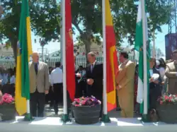- Enfrente de la caseta municipal, ocurre el alzamiento de las banderas, suelen realizarla el alcalde actual para alzar la bandera de El Puerto, el representante de la región dedicada levanta su bandera, un almirante de la armada de la base naval de Rota alza la bandera española y un miembro de la diputación de Cádiz alza la bandera de Andalucía.