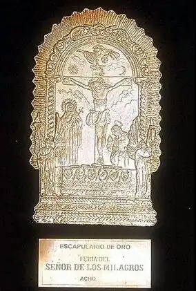 El Escapulario, tanto el de oro como el de plata, es una imagen tallada en alto y bajo relieve en oro de la limeña advocación del Señor de los Milagros.