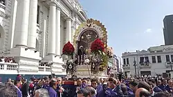 Procesión del Señor de los Milagros recorriendo las calles de Lima
