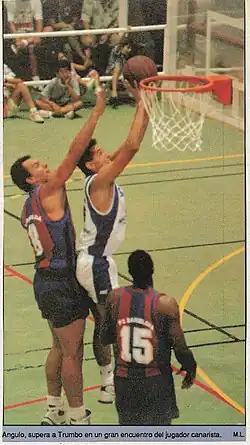![]() Fernando Angulo en un partido Caja Canarias - FC Barcelona, junto a Audie Norris y Steve Trumbo (agosto de 1990) | ||
