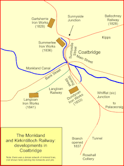 La línea de Monkland y Kirkintilloch quedó atrás muy pronto. Tenía un ancho de vía que impedía trabajar con las redes en desarrollo; y para transportar minerales a Glasgow, dependía del transbordo a un canal o de la transferencia a otra línea (el G&GR). Además, para llegar a Edimburgo era aún peor: el acceso era por el Ferrocarril de Ballochney, con dos planos inclinados accionados con cuerdas, luego por la línea de Slamannan, con otro plano inclinado trabajado con cuerdas, y finalmente transbordando en Causewayend al Canal Union.