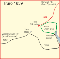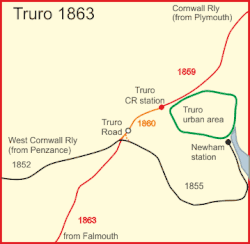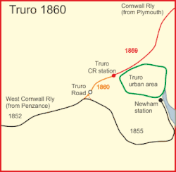 Cuando el Ferrocarril de Cornualles llegó a Truro en 1859, era posible viajar en tren desde Penzance hasta Londres, cambiando de tren en Truro debido al distinto ancho de vía de las dos líneas que componían el trayecto.