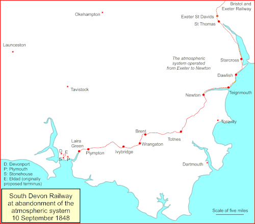 El 18 de agosto, un tren de mercancías de once vagones, con un peso de 120 toneladas largas (122 t), recorrió la distancia de 8+1/4 de milla (13,3 km) entre Exeter y Starcross en 15 minutos.[nota 8] El 8 de septiembre de 1847, además del servicio habitual de trenes tirados por locomotoras, comenzaron a circular cuatro más, propulsados por el sistema atmosférico. Este fue el primer uso público del sistema en el Ferrocarril del Sur de Devon. Aunque la línea se abrió hasta Newton Abbot, entre esa estación y Teignmouth se emplearon locomotoras, pero el vagón de pistones en el tren de bajada siguió hasta Newton, donde fue retirado con los vagones superfluos y colocado en una línea conveniente para ser unido al tren ascendente cuando fuese necesario, de modo que, al llegar a Teignmouth, donde se retiró la locomotora, el vagón equipado con el pistón puso en marcha el tren cuando se le dio la señal.[14]