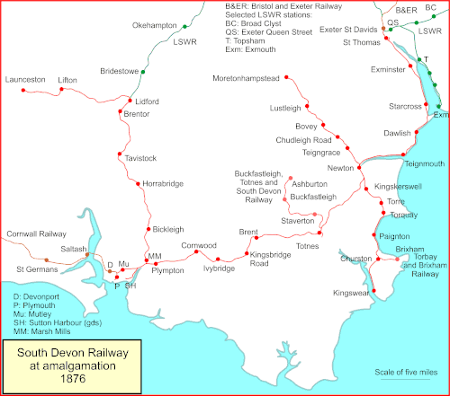 La única estación intermedia estaba en Wrangaton (más tarde rebautizada como Kingsbridge Road), pero poco después se abrieron estaciones adicionales en Brent, Ivybridge y Plympton, y en 1852 Cornwood también recibió una estación. Se colocó vía doble en Rattery Bank, y de Hemerdon a Laira Green.[1]