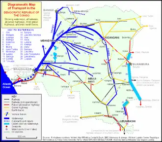 - ↑ «Republique Democratique du Congo, Carte Generale» (en francés). 7 de abril de 2006. «UNJLC Map Num: UNJLC-DRC-001-v08». Esta fuente distingue entre líneas "operativas" y "muy degradadas", pero los detalles de algunos tramos quedan ocultos por las carreteras.