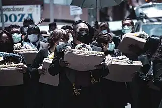 ![]() Dos ñatitas con cigarrillos y coronas de flores en el Cementerio General de La Paz | ||