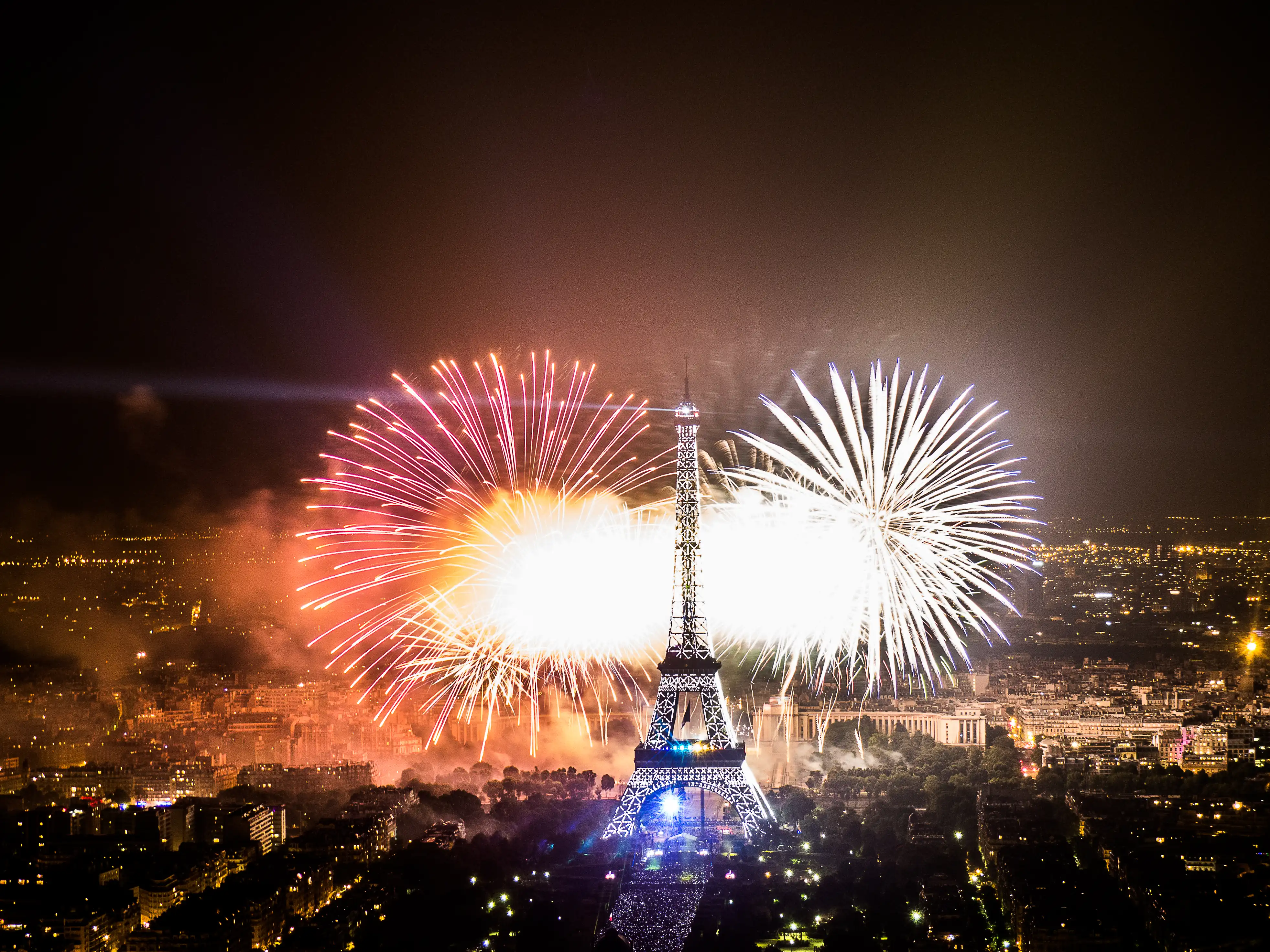 Estos espectáculos nocturnos tienen lugar alrededor de lugares despejados de las ciudades, como explanadas, parques o cuerpos de agua. De un coste alto, los fuegos artificiales son espectáculos muy apreciados, sobre todo cuando son grandiosos. De hecho, muchos municipios no tienen los medios humanos y financieros necesarios para organizarlos. Varias ciudades organizan sus fuegos artificiales la víspera por la tarde, el 13 de julio, si se organizan unos fuegos artificiales más grandes el 14 de julio en una ciudad cercana. Este es el caso de numerosos municipios contiguos a la capital.