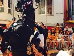 Cuando todos juntos llegan a la plaza, los caballos saltan y danzan al ritmo de la música típica de la fiesta mientras la multitud aplaude y los intenta tocar. Es el Jaleo, el momento crucial en el que por unos instantes la pericia del jinete y la fortaleza del animal permiten que el caballo se sostenga e incluso camine a dos patas, en corveta (bot), casi levantado en el aire por las manos de los que vitorean y rodean a montura y jinete. La incorporación de la música al “jaleo” es más bien reciente, pues se remonta a finales del siglo XIX. Una banda popular que participaba en las fiestas de Ciudadela, hizo sonar una jota aragonesa (de la zarzuela "El Postillón de la Rioja") muy popular por aquella época, y los caballos asustados comenzaron a dar vueltas y hacer piruetas. Y desde entonces se interpreta esta jota durante los jaleos menorquinos. Al terminar la exhibición en la plaza los caixers, en grupos de dos, ponen al galope en la calle a sus caballos y reciben todos unos regalos simbólicos como recompensa por su participación: canyes verdes y culleretes (cucharillas) de plata. La fiesta termina con la ceremonia religiosa de Completes en la Iglesia de Sant Martí.