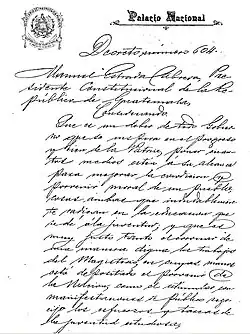 Facsímil del decreto 604, escrito a mano por el presidente Manuel Estrada Cabrera para crear las Fiestas de Minerva.[9]