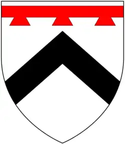 Blasón de Prideaux: En plata, un chevrón de sable acompañado en jefe de un lambel de tres puntas de gules.