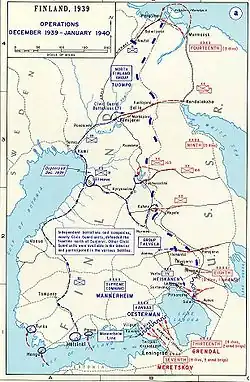La guerra de invierno se libró en tres etapas: el avance inicial soviético, una breve pausa y luego una nueva ofensiva soviética.[7] La guerra se libró principalmente en tres áreas. El istmo de Carelia y el área del lago Ladoga fueron el foco principal del esfuerzo de guerra soviético. Un ataque de dos frentes, con una pinza enganchando a las fuerzas finlandesas en el istmo, mientras que la otra rodeaba el lago Ladoga en un intento de rodear a los defensores. Esta fuerza fue usada entonces para avanzar y capturar la ciudad de Viipuri. El segundo frente estaba en Carelia central, donde las fuerzas soviéticas debían avanzar a la ciudad de Oulu, cortando el país por la mitad. Finalmente, un viaje hacia el sur desde el norte fue para capturar la región de Petsamo.[8] A fines de diciembre, los dos frentes principales se habían paralizado, ya que los finlandeses estaban contraatacando con más fuerza y los soviéticos se estaban estancando. Con el fracaso de dos de sus tres ofensivas a fines de diciembre, la sede soviética ordenó el cese de las operaciones. Para el 27 de diciembre se observó que las fuerzas soviéticas estaban cavando en el istmo de Carelia.[9] Sin embargo, en el norte, los finlandeses habían sido rechazados en Nautsi y con refuerzos tomaron el terreno más alto para detener el avance soviético al sur de Petsamo. Durante este período, se sabe que los finlandeses han acosado columnas de suministros e incluso han llevado a cabo redadas contra posiciones soviéticas fortificadas.[10] Siguió un período de calma en enero de 1940, cuando el ejército soviético volvió a evaluar su estrategia, se rearmó y se reabasteció.[11]