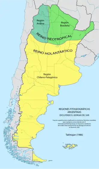 La región Neotropical corresponde a la mayor parte de América del Sur y al istmo centroamericano, área que estuvo separada de los demás continentes durante varios millones de años, por lo que su biota se desarrolló de manera aislada. Esta región se divide en cinco dominios: Caribe, Guayano, Amazónico, Chaqueño, y Andino-Patagónico, de los cuales los tres últimos se distribuyen por el territorio argentino en su porción americana. La región Antártica corresponde a sectores que formaron parte de Gondwana en el sur de América, las islas subantárticas y la Antártida Argentina, desarrollándose dos dominios: Subantártico y Antártico.[13] La clasificación de Cabrera incluye como parte de Argentina a las islas del Atlántico Sur disputadas con el Reino Unido y al sector antártico reclamado por Argentina.