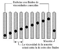 Se define como el tiempo que demora en pasar el líquido de arriba hacia abajo (por su propia masa). La medida de la viscosidad se realiza mediante unos aparatos denominados viscosímetros. Los hay de diferentes tipos: caída de bola, Engler, Saybolt, Redwood, etc. Todos ellos están basados en la caída del fluido a una temperatura determinada. En todos, el tiempo de caída de una determinada cantidad del fluido a testear, multiplicado por la constante del aparato, proporcionará directamente la viscosidad en grados Engler, segundos Saybolt, segundos Redwood, etc. La figura muestra un viscosímetro de caída de bola, en el cual se obtiene la viscosidad relativa del fluido a testear en función de las viscosidades conocidas de otros fluidos.