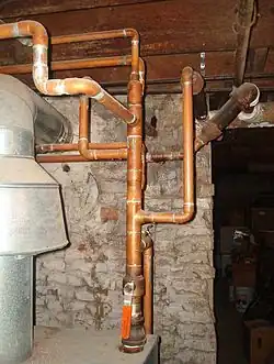 Una tubería de agua es una red de transporte de agua formada por tubos, frecuentemente de plástico o metal,[22] que transporta agua dulce presurizada y tratada a un edificio (como parte de un sistema municipal de agua), así como al interior del edificio.