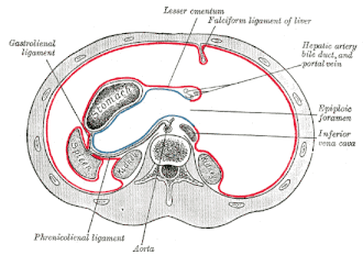 ![]() Disposición del peritoneo en la parte superior del abdomen. | ||