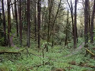 Forest Park es una de las áreas silvestres más extensas y protegidas de Portland.[45] Se localiza al oeste del centro de la ciudad, en la ecorregión de la cordillera de la Costa, lugar protegido por la Agencia de Protección Ambiental (Estados Unidos).[46] El bosque se compone principalmente de tres especies de árboles: el pino de Oregón (Pseudotsuga menziesii var. menziesii), tsuga del Pacífico (Tsuga heterophylla) y el cedro rojo del Pacífico (Thuja plicata), aunque también se encuentra el abeto gigante (Abies grandis), álamo bálsamo Occidental (Populus trichocarpa), aliso rojo americano (Alnus rubra), arce de Oregón (Acer macrophyllum), madroño del Pacífico (Arbutus menziesii), tejo del Pacífico (Taxus brevifolia), entre muchos otros.[47] Otras zonas del parque poseen sotobosques de arbustos bien desarrollados como el red huckleberry (Vaccinium parvifolium) del género Vaccinium, la Gaultheria shallon perteneciente a la familia Ericaceae, Hydrophyllum, Oemleria cerasiformis que es la única especie del género Oemleria, la ortiga mayor (Urtica dioica), entre otras.[48]