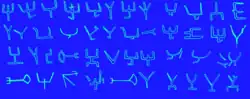 Se encontraron signos similares en forma de tamga en sellos de la fortaleza de Dmítriyevka, en losas de la fortaleza Mayatskoye y en una vasija de arcilla del entierro de un noble guerrero en la necrópolis Podgorovskoye (Salovka). Los hallazgos de signos en forma de bidentes y tridentes de dos caras y unilaterales en varios objetos de la cultura Saltovo-Mayaktskoye se encuentran en piedras, cerámicas, productos óseos, hebillas y colgantes de sello. El uso generalizado del signo puede indicar que sirvió como tamga asociado con un cierto estatus o afiliación familiar del propietario, o que era un símbolo religioso.