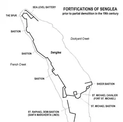 Las fortificaciones de Senglea, tal como son hoy en día, consisten en (enumeradas en el sentido de las agujas del reloj desde el frente terrestre hasta el Espolón):