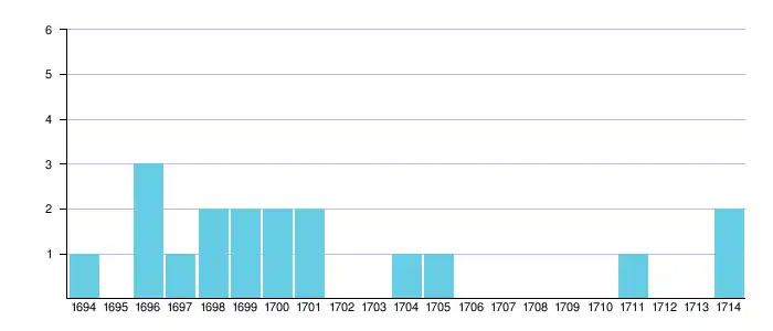 Al margen de los trabajos menores de impresión, que suponen en esta época la mayor parte del trabajo diario; en lo que se refiere a la impresión de libros,[20] en los tiempos previos a la compra de la imprenta, en 1698, y hasta 1701 Neira trabaja con regularidad, pero en lo sucesivo y hasta su muerte predominan los años sin producción, que, por otra parte, vienen a coincidir con los de la Guerra de Sucesión, cuando, entre 1702 y 1713, solo imprime tres obras y todas institucionales. Con la llegada de la paz la actividad, siempre modesta, se reanuda al menos momentáneamente (1714).