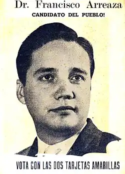 ![]() Afiche electoral de URD con la efigie de Francisco Arreaza Arreaza para las elecciones parlamentarias venezolanas de 1958 | ||
