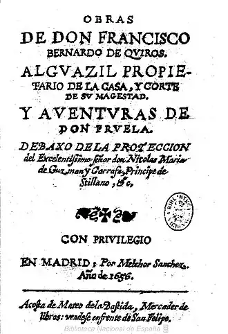 - Obras de don Francisco Bernardo de Quirós y aventuras de don Fruela, por el alguacil propietario de la Casa de Corte de su majestad (Madrid, 1656). Incluye diez entremeses y la comedia burlesca El hermano de su hermana. Hay edición moderna: Obras de Francisco Bernardo de Quirós y Aventuras de don Fruela, edición de Celsa Carmen García Valdés. Madrid, Instituto de Estudios Madrileños (C.S.I.C.), 1984.
