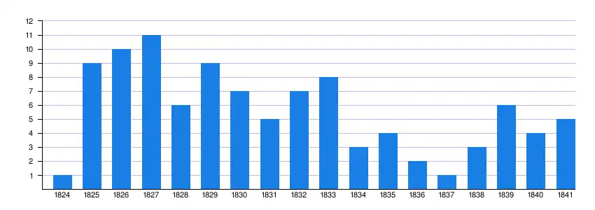 Para el periodo aquí estudiado (1824-1841) se conocen 101 impresos, que ofrecen una media anual de 5,6 que se sitúa por encima de la del conjunto de las imprentas pamplonesas que es de 3,6.[7]