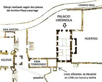 El otro pertenece a la rama que proviene del primo de Francisco de Urdiñola, Martín Pérez Urdiñola, el cual era en aquella época por herencia señor de la casa Agirre y se benefició de los bienes que Francisco poseía en el valle. Ese escudo de armas en el que aparece un águila se le reconoció a Antonio Urdiñola, biznieto de Martín, el cual amasó una fortuna con el comercio de Indias, y fue certificado por Juan de Mendoza el año 1689.[20] Ese escudo pasó al palacio Urdiñola cuando Antonio compró el palacio a su tío Ignacio Maleo Urdiñola desde Cádiz por medio de Sebastián Lecuona. Antonio se retiró posteriormente al palacio ostentando él y las siguientes generaciones el escudo del águila. Cuando vendió sus negocios adquirió caseríos y tierras, creando con ellos cuatro mayorazgos, los cuales le proporcionaron una renta segura a él y a sus descendientes. En 1795, en la Guerra de la Convención, quemaron la casa Torrondo y el añadido del palacio, y hacia 1873, en la última Guerra Carlista, fue incendiado el palacio. Unos años más tarde con los restos del palacio construyeron la terraza que rodea la torre del campanario de la iglesia y las dos escaleras laterales traseras. Romana Urdiñola, mujer de Vicente Artazkoz, levantó un palacete en dicho solar, donde se colocaron el escudo familiar y dos columnas que se alzaban en la entrada del antiguo palacio como testimonio de haber pernoctado en él un rey castellano. Hoy en día también ha desaparecido el palacete y se ha edificado en el mismo solar el Centro Cultural Landetxe, pero se han conservado en sus jardines, tanto el escudo como las columnas.