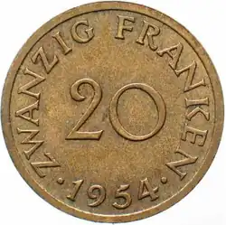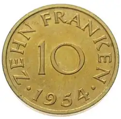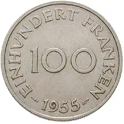- ↑ The Federal Republic of Germany fixed that rate and converted older obligations denominated in Saar francs at this rate into Deutsche Mark. Cf. the federal act on compensations "Bundesgesetz zur Einführung des Bundesgesetzes zur Regelung der rückerstattungsrechtlichen Geldverbindlichkeiten des Deutschen Reichs und gleichgestellter Rechtsträger (Bundesrückerstattungsgesetz - BRüG) im Saarland", which - in its Art. II, No. 8 - mentions the official rate.