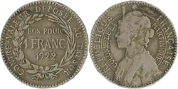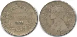 En los años 1897 y 1922 se han emitido monedas con las denominaciones de cincuenta céntimos y un franco, ambas en cuproníquel.[13] En el cuadro subsiguiente se detallan cada una: