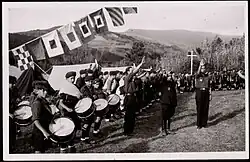 Inauguración de un campamento de "flechas" y "pelayos" en la localidad vizcaína de Baquio durante la Guerra Civil (julio de 1938): izado solemne de la bandera.