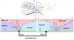 - En una oclusión fría, la masa de aire frío que supera a la masa de aire caliente que se encuentra delante y pasa por debajo de ambas masas de aire, y a menudo tiene las características de un frente frío.