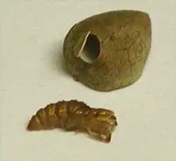 Después de que el huevo haya nacido, la larva se come el interior del frijol, creando espacio para sí misma.[2] Se adhiere al frijol con varios hilos de seda.