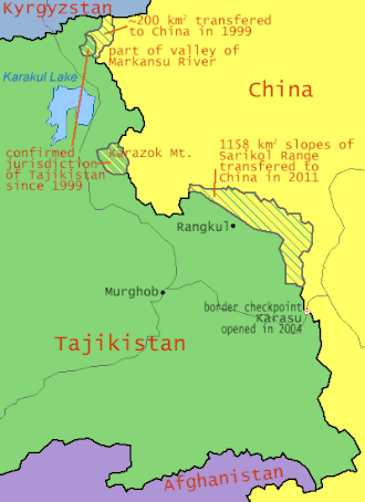 En 2011, Tayikistán ratificó un acuerdo de 1999 para ceder 1.000 km² de tierra en las montañas del Pamir a la República Popular de China, terminando así con una disputa de 130 años. En el tratado, China también renunció a reclamaciones sobre 28 000 km² de territorio tayiko.[2][3]