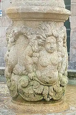 Realizada en piedra y situada en la plaza del Hierro, conocida en el pasado como «Cruz dos Ferreiros» («Cruz de los Herreros») y punto donde confluyen cinco calles, [nota 5] lo que hace que tenga un perímetro triangular, la fuente se asienta en el centro de un gran pilón lobulado de planta hexagonal. Del eje central parte un pilar compuesto por un total de tres cuerpos y rematado todo por un coronamiento. Descrita por Florentino Cuevillas como «muy del quinientos, resalta por su elegancia renacentista y con mucha y oscura mitología», sobre una base con forma de hexágono macizo se yergue el primero de los cuerpos, formado por cuatro relieves femeninos semejantes a nereidas (ninfas de los mares), por lo general representadas cabalgando sobre delfines o caballos marinos, si bien en este caso tan solo figura la mitad superior de las mismas surgiendo del agua y enlazadas unas con otras mediante coronas de follaje que sujetan bajo los brazos.[6]: 288