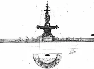 Entonces, en 1876 se planteó la colocación de otro monumento en la plaza, y por iniciativa del arquitecto Antoni Rovira i Trias se decidió la instalación de esta fuente, copiada de un modelo francés elaborado diez años antes por Antoine Durenne sobre un diseño de Louis-Tullius-Joachim Visconti. La fuente está compuesta por un estanque circular en cuyo centro se alza una taza con seis mascarones que arrojan agua, sobre la que se ubican las estatuas de las Cárites, rematadas por otra taza superior. Antiguamente estaba rodeada de un parterre circular de césped cercado por una barandilla baja de hierro, y el estanque de la fuente quedaba a ras de suelo; posteriormente se eliminó este parterre y se circundó el estanque con un muro bajo de piedra.[3]