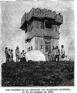 "...Comenzó la coremonia á las diez de la mañana con la bendición del blockhaus avanzado por el Rvdo. F. Suárez, luego bendijo el mismo las demás partes del fuerte; se izó el pabellón al son de la Marcha Real y dio el Coronel Gobernador vivas á la patria, á SS. MM. el Rey y la Reina y al Capitán general, todos los cuales fueron contestados con entusiasmo. A las doce bubho banquete, al que asistieron, invitados por el Coronel Gobernador los jefes y oficiales de la fuerza. Pronunciáronse entusiastas brindis, y en todos hubo recuerdos para el valeroso ejercito que en Cuba pelea por la integridad de la patria...."