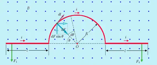 y cuya dirección es radial hacia O, que es el centro del arco. Solamente la componente hacia abajo de esa fuerza es efectiva, porque la componente horizontal es anulada por una componente directamente opuesta proveniente del correspondiente segmento de arco a la derecha de O. En consecuencia, la fuerza total sobre el semicírculo de alambre alrededor de O apunta hacia abajo y es: