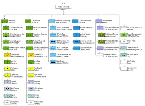Una mayor reorganización de las Fuerzas Armadas Eslovenas está siendo llevado a cabo en la actualidad, con el fin de modificarla desde una fuerza de defensa territorial en una fuerza desplegable principalmente dirigida al mantenimiento de la paz. Después de 1993, las Fuerzas Armadas Eslovenas se habían basado en el servicio militar obligatorio, con conscriptos recibiendo 6-7 meses de entrenamiento. En 2003, el gobierno esloveno abolió la conscripción y para julio de 2004, las Fuerzas Armadas Eslovenas habían sido casi reorganizadas en un ejército profesional ahora basado en voluntarios. En la actualidad hay aproximadamente 7.600 tropas activas y aproximadamente 1.700 en reserva, reducido desde 55.000 efectivos durante el servicio militar obligatorio. Las unidades operacionales ahora consisten en tres brigadas, la 1.ª, la 72.ª, y una Brigada de Defensa Aérea y Aviación; todas tres subordinadas al Comando de Fuerzas.