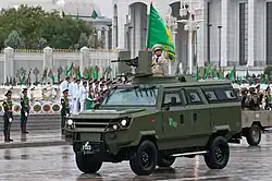 El número de vehículos es de alrededor de 2.000, el número de tanques es de aproximadamente 700 y el número de piezas de artillería es de unos 560.[23] El equipamiento de las fuerzas terrestres de Turkmenistán incluye 702 T-72,[24] y 10 T-90, encargados en 2009 por aproximadamente 30 millones de dólares.[25][26] Los AIFV / APC incluyen BTR-60/BTR-70/BTR-80 - 829,[24] BMP-1/BMP-2 - 930,[24] BRM-1 12, y BRDM-2 - 170. En 2021 Turkmenistán tiene previsto recibir de Serbia un lote de vehículos blindados Lazar 3 8x8.[27]