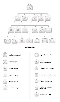 - ↑ «Copia archivada». Archivado desde el original el 5 de noviembre de 2013. Consultado el 17 de agosto de 2013. Structure of Land Forces