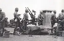 Unidades de Guardia (警備隊 Keibi-tai) de 100 a 1.500 unidades de hombres responsables de la defensa terrestre de las instalaciones de la Marina Imperial Japonesa. Fueron frecuentemente asignados a las Fuerzas de Base y las Fuerzas Especiales de Base. Los japoneses levantaron alrededor de cien de estas unidades. Muchas de estas unidades jugaron un papel importante en la defensa de las islas japonesas durante las últimas etapas de la guerra, como el Iwo Jima Keibi-tai que constaba de 1.000 hombres liderados por el Capitán Samaji Inouye.Infantería de Marina Japonesa operando la artillería.Unidades de Defensa Antiaérea (防空隊 Bōkū-tai) unidades de artillería antiaérea de 200–350 hombres. Había tres tipos que diferían según el número y el tipo de armas antiaéreas asignadas. Los japoneses formaron más de doscientas de estas unidades, que estaban ubicadas principalmente en áreas fuera de Japón, Formosa y Corea. Por lo general, estaban asignadas a las Fuerzas de Base, las Fuerzas Especiales de Base, Fuerzas Navales Especiales y Unidades de Guardia.