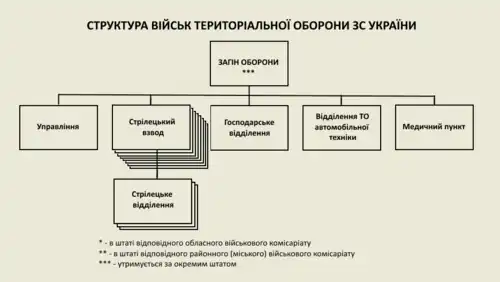 A finales de 2014 el sistema de defensa territorial de Ucrania cambió.[11] Los Batallones de defensa territorial fueron reorganizados y transferidos a la brigada de infantería mecanizada del Ejército.[12] Para reemplazarlos, una nueva estructura de Las fuerzas de defensa territorial de las Fuerzas Armadas se fueron introduciendo gradualmente.[2]