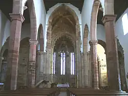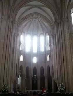 Las órdenes mendicantes (franciscanos, dominicos, carmelitas, agustinos) impulsaron el nuevo estilo con sus construcciones conventuales ("gótico mendicante")[1] en las ciudades portuguesas de los siglos XIII y XIV (iglesias franciscanas y dominicas de Santarém y Guimarães, Mosteiro de Santa Clara-a-Velha -Coímbra, hoy en ruinas-, los conventos de San Francisco y Santa Clara -Vila do Conde- el convento do Carmo -Lisboa, hoy en ruinas y usado como museo arqueológico-, etc.) También las órdenes militares contribuyeron a la expansión del Gótico (iglesia de São João de Alporão -Santarém-,[2] monasterio de Leça do Bailio -caballeros hospitalarios-,[3] iglesia de Santa Maria dos Olivais[4] -Tomar, templarios-). Algunas catedrales portuguesas también fueron construidas en estilo gótico (Catedral de Évora, siglos XIII-XIV, Catedral de Silves, siglos XIV-XV, y Catedral de Guarda, finales del siglo XIV-XVI).
