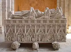 - ↑ AFONSO, Luís Urbano (2000) - O ser e o tempo - as idades do homem no gótico português, Caleidoscópio, Casal de Cambra. SILVA, José Custódio Vieira da (2003) - O Panteão Régio do Mosteiro de Alcobaça - IPPAR, Lisboa. Fuentes citadas en Túmulos de D. Pedro I e de Inês de Castro