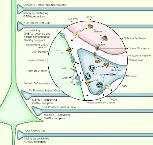 La estrecha relación entre el receptor GABA y el sistema endocannabinoide[47] tiene implicaciones fundamentales en la regulación de la actividad neuronal y diversos procesos fisiológicos. El sistema endocannabinoide, un sistema de neurotransmisión que utiliza cannabinoides endógenos (endocannabinoides), desempeña un papel crucial en la modulación de la actividad neuronal.
