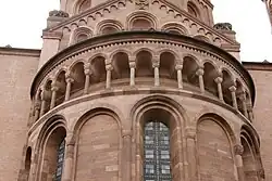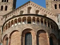 Catedral de Espira, ábside con galería enana también 1082-1106, bóvedas de cañon transversales, pared trasera vertical.