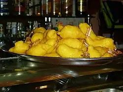 Las Gambas con gabardina es una tapa típica de los bares de cocina española que consiste en gambas revueltas en una masa de harina de trigo y maicena que posteriormente se fríen para que sean ingeridas en un plato a modo de ración. Suele dejarse una parte de la gamba fuera de la masa frita en aceite de oliva virgen hirviendo para que sea manejable por el comensal, la masa suele ser de color amarillo debido en parte al uso de colorantes o de azafrán. La denominación gabardina hace referencia a la masa con la que se recubren las gambas.