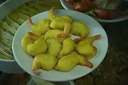 Por regla general se le quitan las cabezas a las gambas antes de ser rebozadas en la masa, dejando sólo el cuerpo y la cola con la piel. La cola se suele emplear como un elemento que ayuda al consumidor. Se sirve el plato recién frito, no conviene dejar esperar mucho tiempo. Suelen comerse con los dedos y no se emplea ningún cubierto.